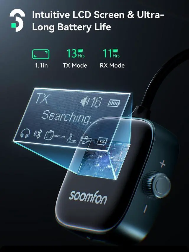 LCD Display for Easy SetupThe Bluetooth transmitter for tv is equipped with an LCD display that clearly shows the device status, pairing mode, and names of connected devices. Easily switch between TX and RX modes, monitor Bluetooth connections, and manage dual-paired devices at a glance. The Bluetooth Transmitter with user-friendly interface makes setup fast and hassle-free, even for first-time users.
