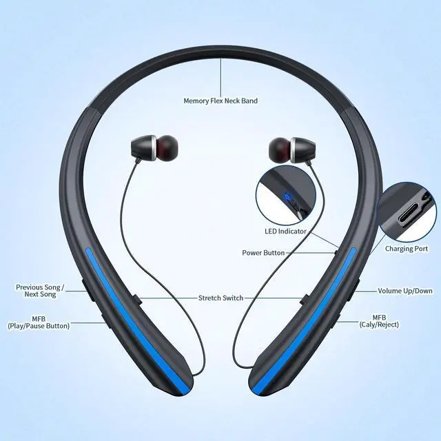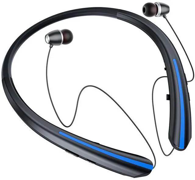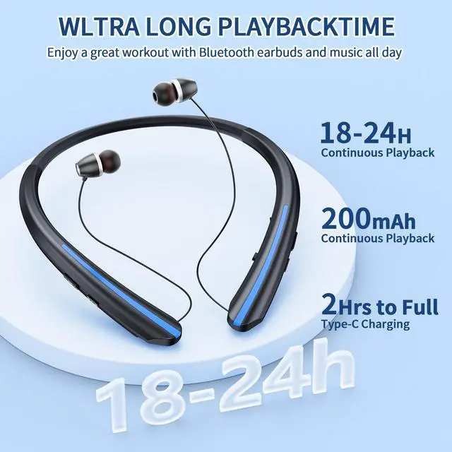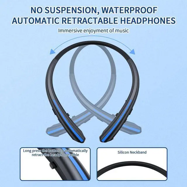 Ergonomic Neckband Retractable Bluetooth Headphones Our wireless headset features an innovative retractable earbud design that allows you to adjust the wire length for a perfect fit; The soft neckband ensures all-day comfort during workouts or commutes