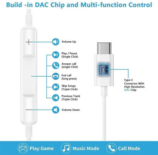 This usb type c headphones for iPhone 16e iPhone 16 support Volume+/-, Last/Next Track, Pause, Answer/End/Reject Call functions