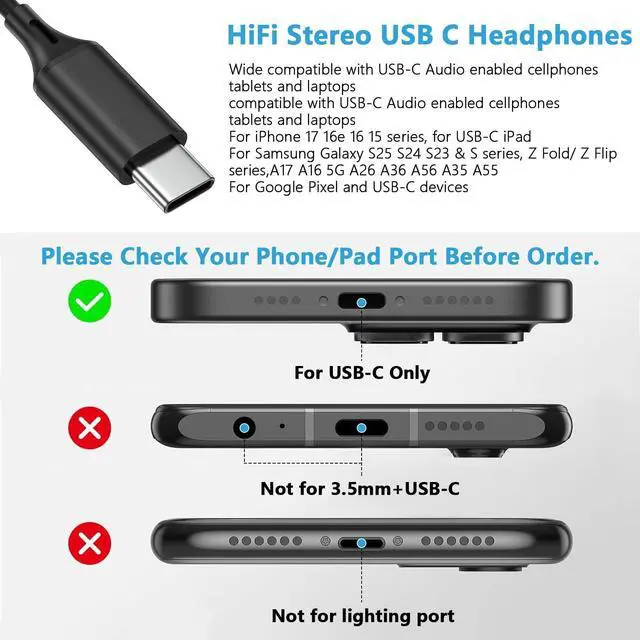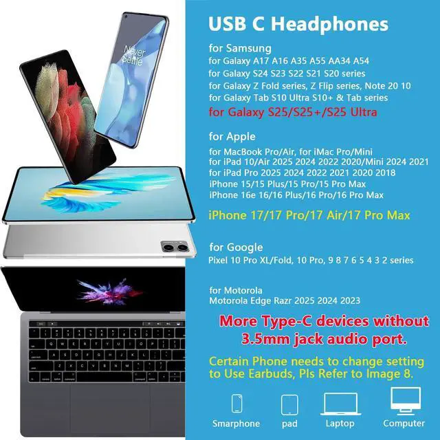Samsung Wired Headphones USB C for Samsung Galaxy A17 A16 5G S25 FE Ultra , iPhone 17 Air 16 15 series, Google Pixel 10 Pro XL/Pro, ect