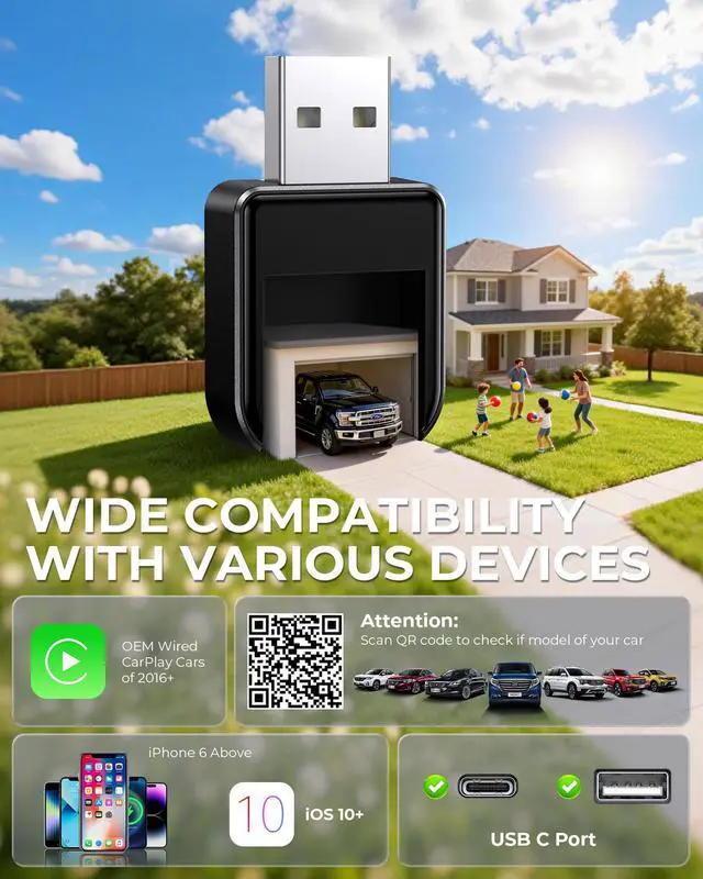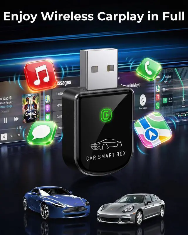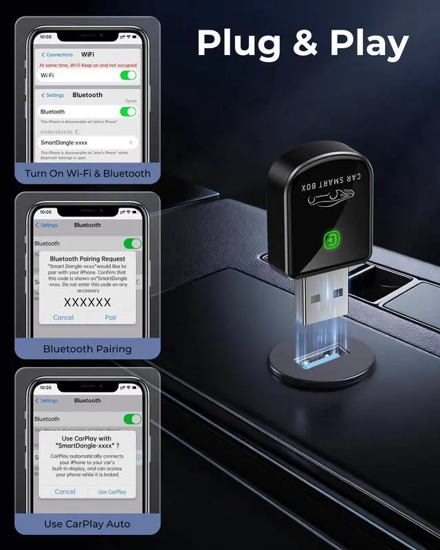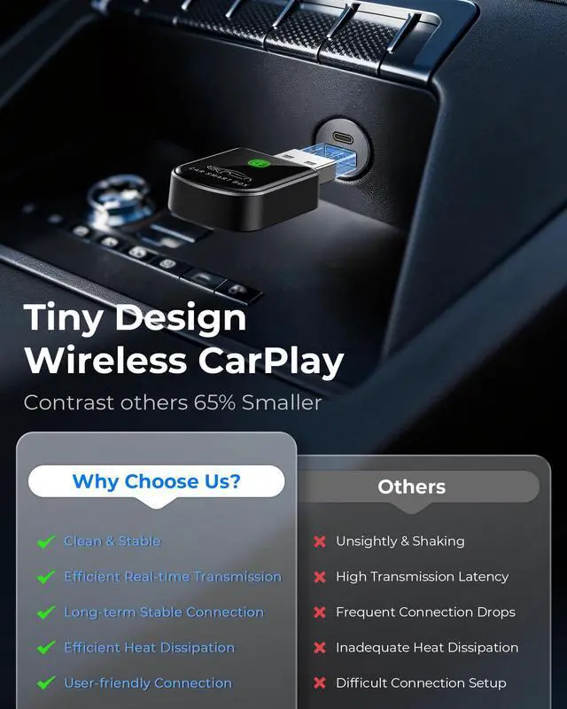 TRUE WIRELESS FREEDOM Cut the cord and declutter your dashboard. Seamlessly convert factory Wired CarPlay into a stable wireless connection. Enjoy effortless Navigation Systems, music streaming, and Siri commands without the cable mess, all powered by our mini bluetooth Car Play adapter.