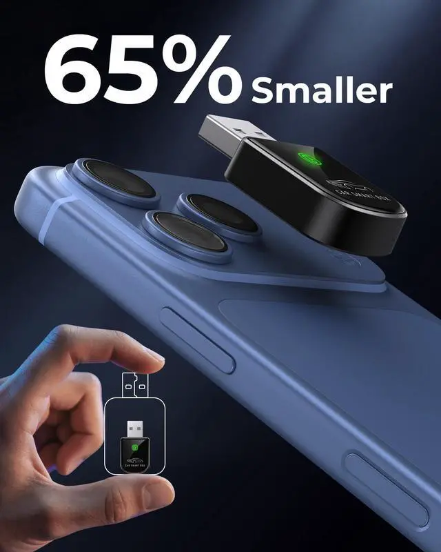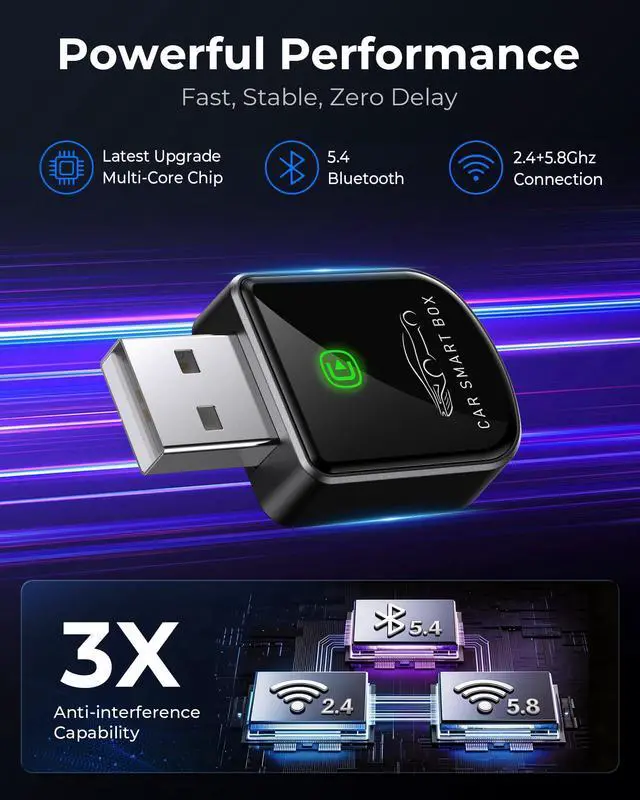 RELIABLE PERFORMANCE Powered by 2.4 + 5.8GHz dual-band Wi-Fi and Bluetooth 5.4, delivering 40% better performance than other wireless CarPlay adapter for Apple. Provides ultra-stable connection for Global Positioning Systems, music, and calls, with near-zero latency and no audio stuttering. Enjoy smooth and reliable performance on every drive.