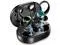 Text reads 'IP7 WATERPROOF'. Black wireless earbuds with green accents shown with water droplets, demonstrating waterproof capability.