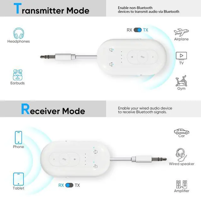2 in 1 Transmitter & Receiver: Switch to Receiver modes to turn non-Bluetooth gear (car stereos, wired speakers, vintage audio) into wireless devices; stream music from phone/laptop wirelessly