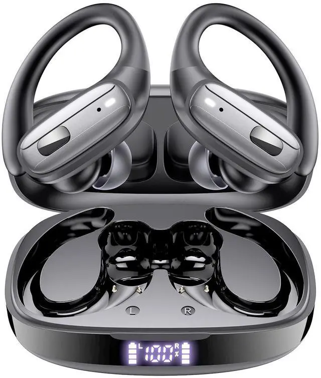 Wireless Earbuds, Bluetooth Headphones 5.4, Ear Buds with Hooks for Sports, 80Hr Playtime Earphones, LED Display, IPX7 Waterproof Headset for Workout Running, Charcoal