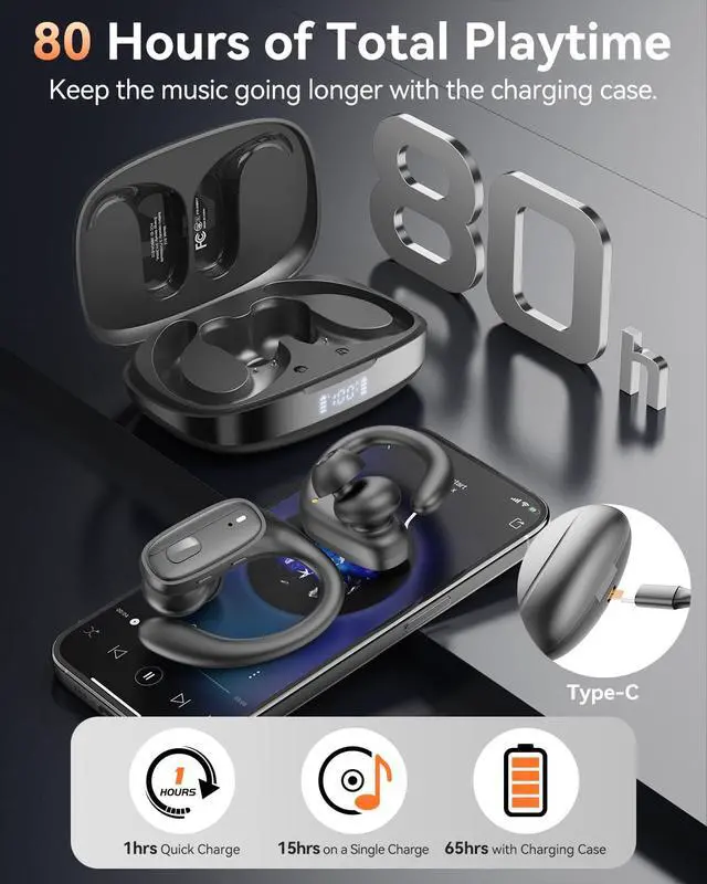 LONG BATTERY LIFE Up to 80 Hours of Total Playtime. Enjoy up to 15 hours of playtime on each ear bud, with an additional 65 hours provided by the charging case. A quick 15-minute charge gives you 2 hours of use, while a full 1-hour charge ensures youre powered up for long sports sessions or workouts.