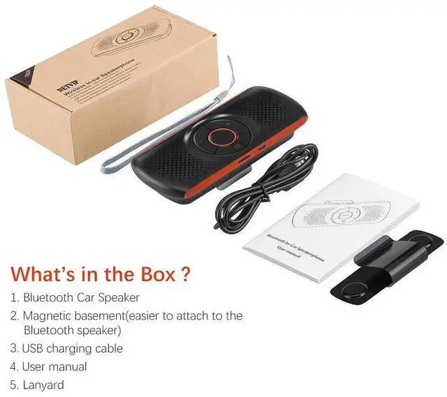 - Package Contains: 1x Car Bluetooth Speaker, 1x USB Charging Cable, 1x Durable Magnetic Back-clip,1x Lanyard, 1x User Manual