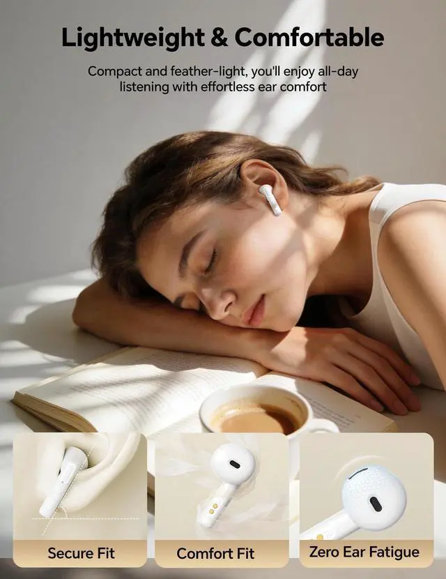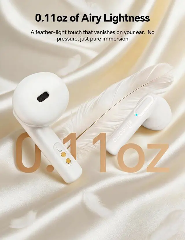 ULTRA-LIGHTWEIGHT & ZERO-PRESSURE FIT: Built for the long haul, these wireless earbuds weigh a mere 0.11 ozlighter than a sheet of paper. Whether its back-to-back Zoom calls, deep-focus study sessions, or an all-day podcast streak, youll forget youre even wearing them. While others deal with ear fatigue, youll stay comfortable. Unlike silicone ear buds, our ergonomic semi-in-ear design lets your ears breathe. No pressure, no "plugged-up" feelingjust pure, effortless listening