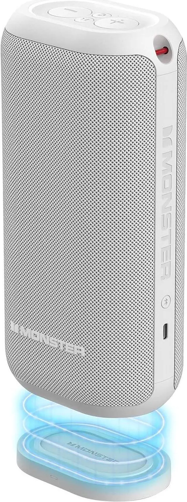 The Monster DNA MAX is a rugged, portable Bluetooth speaker known for its omni-directional sound (360° audio from four drivers), IP67 waterproof/dustproof rating, and long 20-hour battery life, coming with a Qi wireless charging base, USB-C charging, and Party Mode for linking up to 99 units. Key features include Bluetooth 5.2, a 150ft range, USB-C for charging other devices, and a stylish, fabric-covered design with a strap for portability.