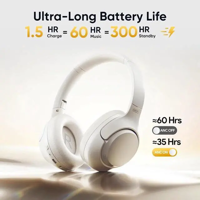 60-Hour PlaytimeQCY H3 wireless headphones provide over 60 hours of playtime in ANC OFF mode. The standby time is over 350 hours at full charge, and it comes with a 3.5 mm audio cable for switching to wired mode anytime, so you dont have to worry about running out of battery.