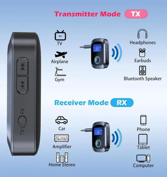 BLUETOOTH TRANSMITTER AND RECEIVER: Meet all your Bluetooth requirements. 3.5 mm Bluetooth adapter supports Bluetooth transmitter and receiver TX and RX modes. In TX mode enjoy wireless connectivity with in-flight entertainment systems gym equipment and TVs. Switch to RX mode effortlessly to stream audio from your phone or tablet to your wired speakers or car stereo system.