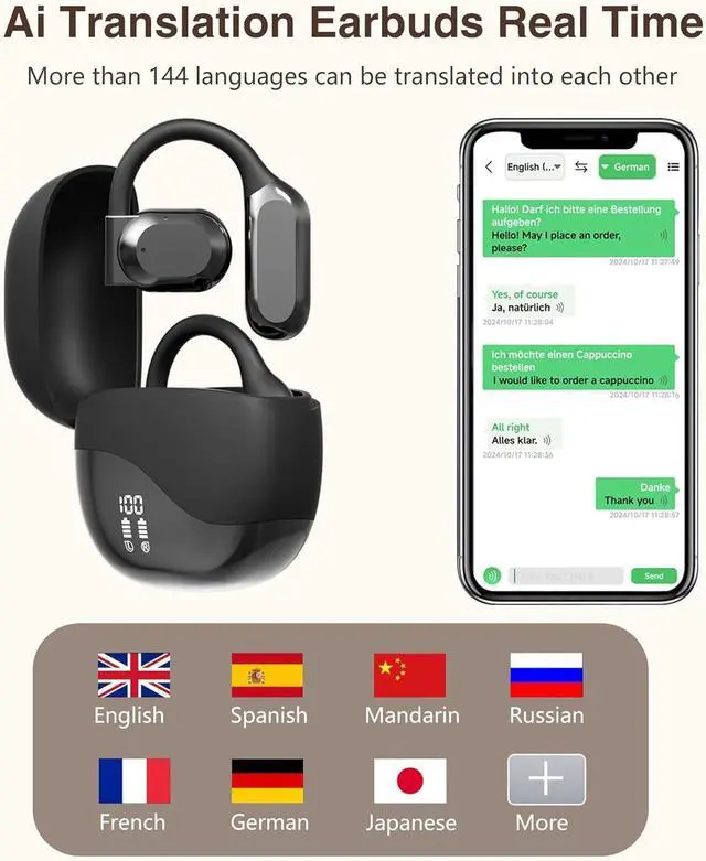 Real-Time Translation in 144 Languages: Break language barriers instantly with our AI translator earbuds, supporting real-time translation earbuds in 144 languages including Chinese, English, Japanese, Korean, Russian, German, French, Spanish, Arabic, Dutch, Hindi, Indonesian, Italian, Portuguese, and Thai. Perfect for international business, travel, and learning, ensuring seamless communication in any situation.