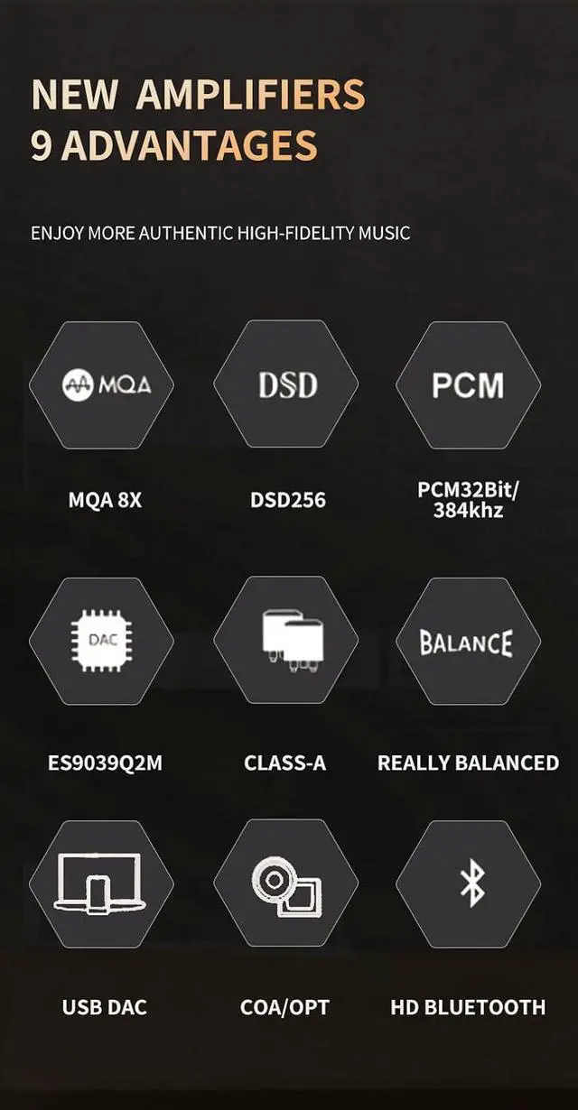 KEEP ON PERFECTING PROFESSIONAL POWER CHIPSREFINED MATERIAL SELECTION, KEEP ON PERFECTING. Imported chips, professional power chips. High-end capacitor design to ensure high-fidelity sound quality. Using newest DAC chip ES9039Q2M as the decoding chip, the sound quality is even better.