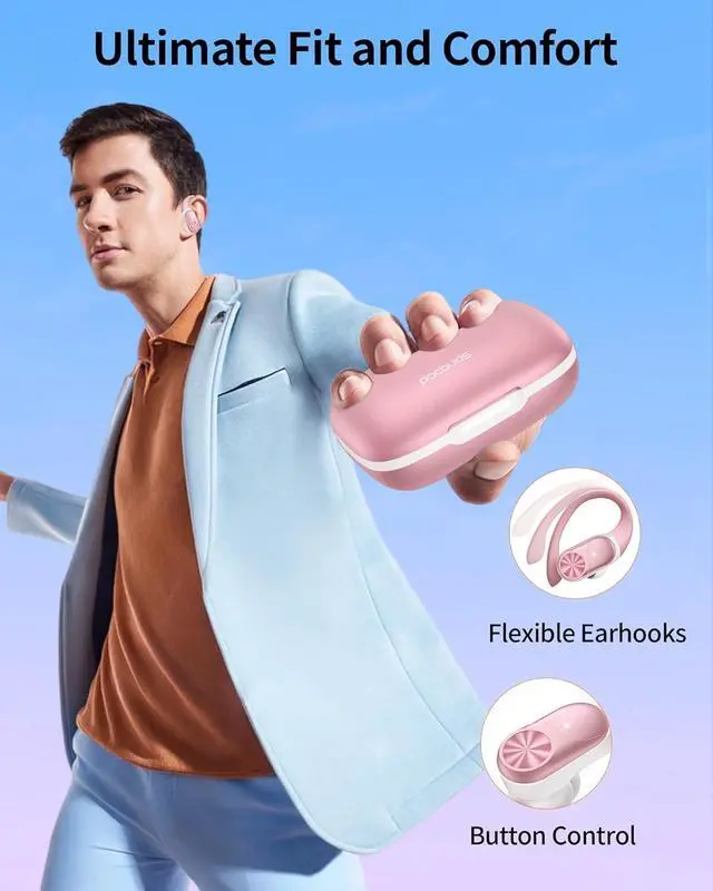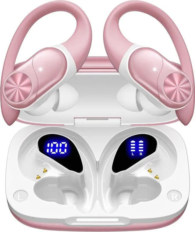 PocBuds Bluetooth Headphones Wireless Earbuds 80hrs Playtime Wireless Charging Case Digital Display Sport Ear Buds with Earhook Deep Bass IPX7 Waterproof Over-Ear Earphones for Phone Laptop Rose Gold
