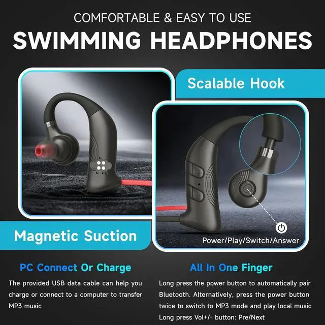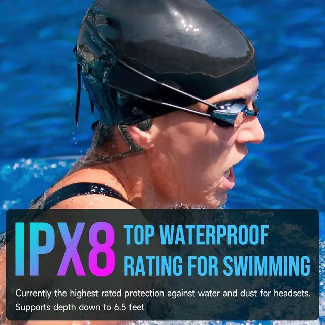 1IPX8(IP68) TOP Waterproof2With Swim Goggles & Cap 3Call/Fitness4Running/Swimming5A Great GiftThe video showcases the product in use.The video guides you through product setup.The video compares multiple products.The video shows the product being unpacked. Merchant Video It solves the vast majority of the pain points of traditional bone conduction swimming headphones