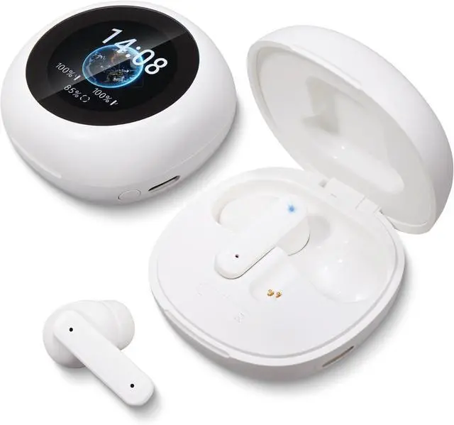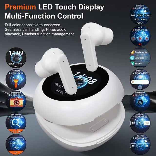 Smart LED Touch Screen Charging Case: The wireless earbuds have a large LED touch screen that allows you to check the date and time, as well as clearly display the battery level and bluetooth connection status of the earbuds and charging case.It also has find your headphones wireless bluetooth, sound effect selection, ambient sound, equalizer, voice assistant, flashlight,take photos, adjust brightness, adjust time, set alarm, adjust song volume and skip songs, display lyrics and other functions.This makes your wireless earbuds bluetooth easy to manage music and calls.
