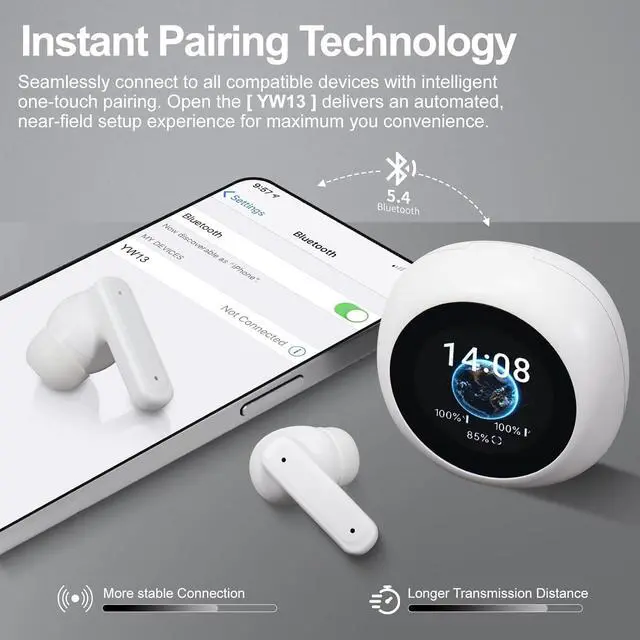 Latest Bluetooth 5.4 Technology: The Wireless Headphones Bluetooth quipped with the latest Bluetooth 5.4chip and flash-pairing technology,this wireless earbuds has a 30% faster transmission speed, more stable signal connection, no delay, whether you are in the gym, sports, running, yoga, you will not lose the signal or interrupt the music. Thanks to the magnetic Hall effect technology, after the first pairing, just take the Bluetooth earbuds out of the charging box to achieve an immediate connection, and the connection distance can reach up to 15m.