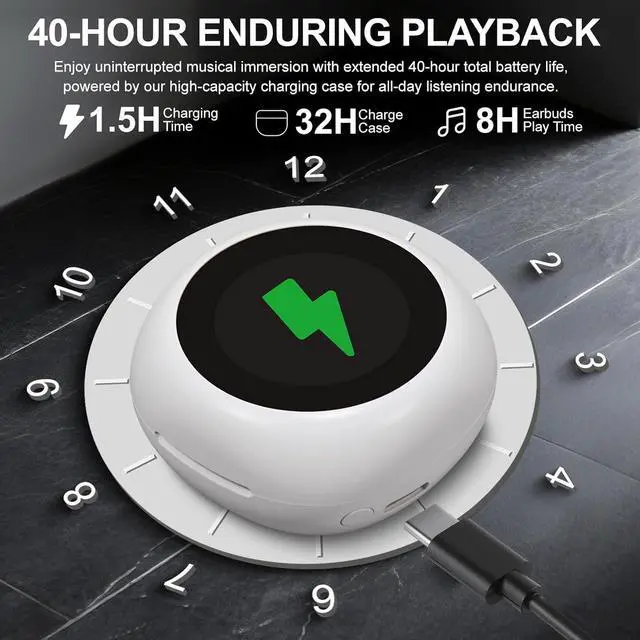 10-Minute Quick Charge and Long PlaybackThe wireless earbuds enjoy up to 6 hours of playtime on a single charge, extended to 40 hours with the 380mAh charging case. The bluetooth earbuds Type-C quick-charge fully charges the case in 1.5 hours, and a 10-minute quick charge provides 2 hours of playback. Easily monitor power status with the LED percentage display, ensuring all-day use without battery worries. THE Earbuds Wireless Bluetooth perfect for travel, workouts, and daily commutes. Stay connected and entertained wherever you go.