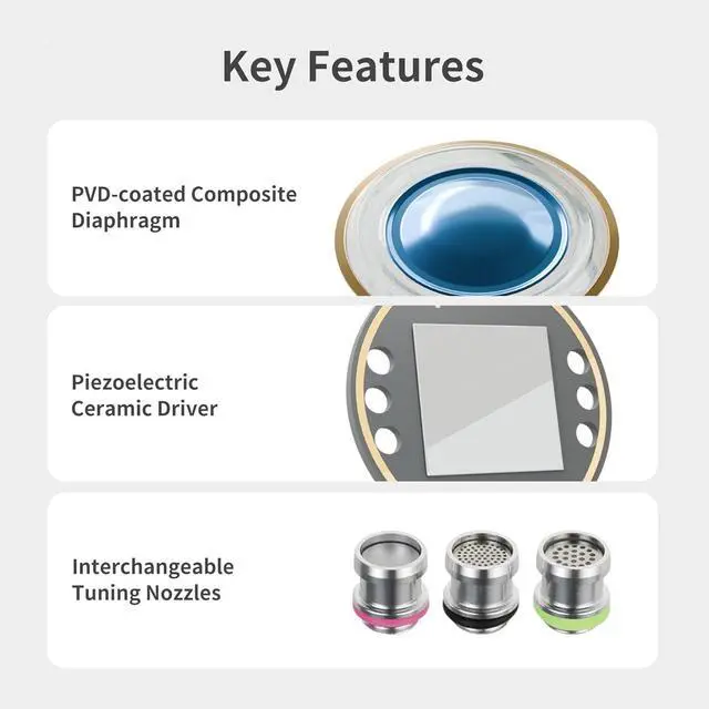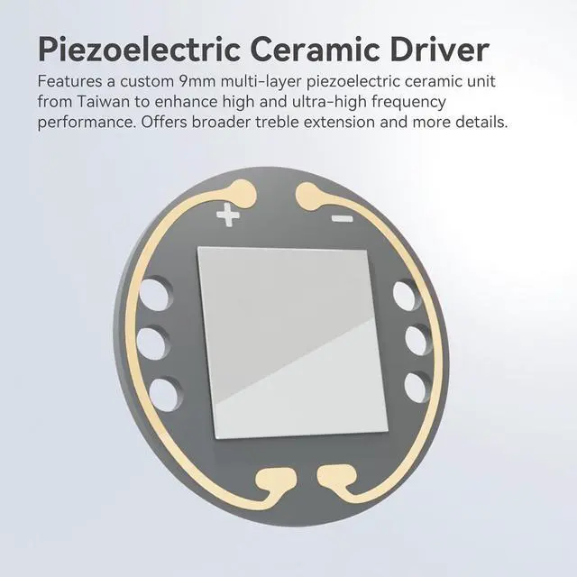 Features a custom 9mm multi-layer piezoelectric ceramic unit from Taiwan to enhance high and ultra-high frequency performance. Offers broader treble extension and more details