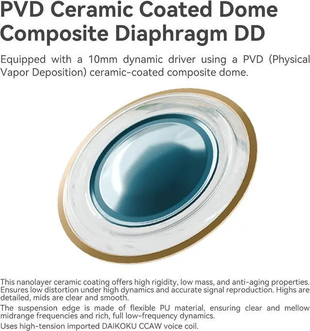 10mm dynamic driver using a PVD (Physical Vapor Deposition) ceramic-coated composite dome. Ensures low distortion under high dynamics and accurate signal reproduction. The suspension edge is made of flexible PU material, ensuring clear and mellow midrange frequencies and rich, full low-frequency