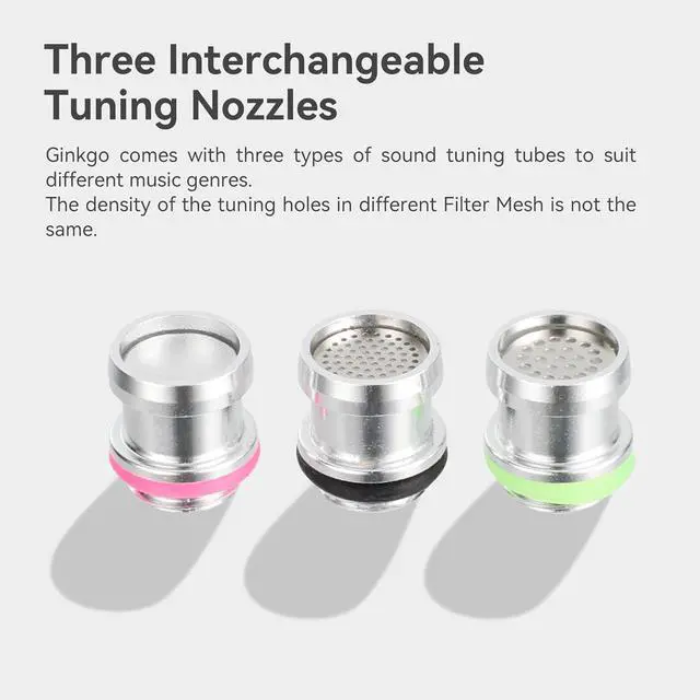 Ginkgo comes with three types of sound tuning tubes to suit different music genres. The density of the tuning holes in different Filter Mesh is not the same. Pink: The pink curve (Harman-like tuning) Green: The green curve(Boosted mids and highs) Black: The black curve(Balanced between the two) Full frequency range with low distortion, high fidelity reproduction of audio signals