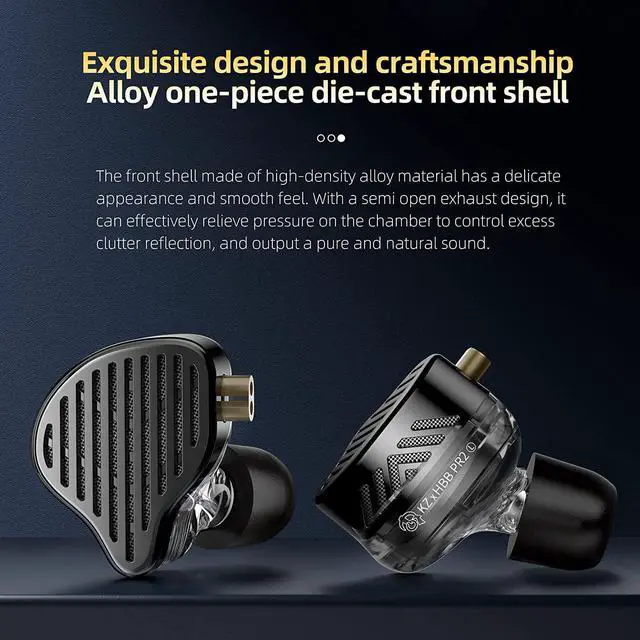 Exquisite design and craftsmanshipThe Front side of KZ PR2 in ear earbuds is made of high-density one-piece die-casting alloy material, resulting in a delicate appearance and smooth feel.The semi-open exhaust design can effectively relieves cavity pressure and controls clutter reflection for optimal sound quality.