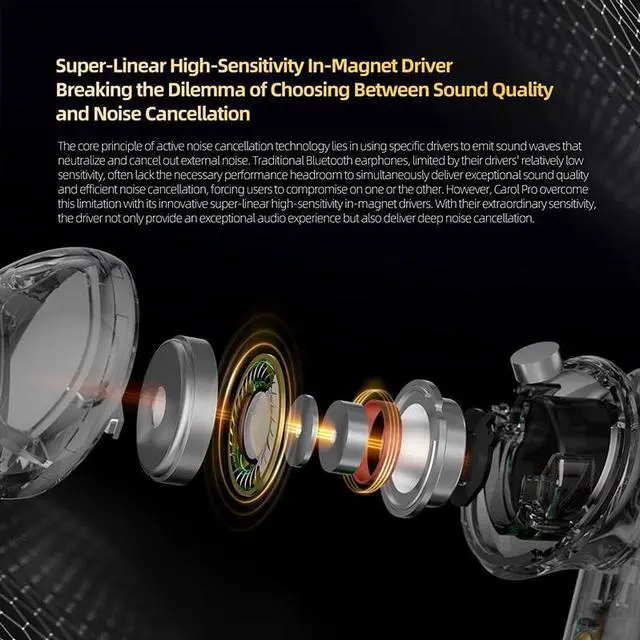 SUPER LINEAR HIGH SENSITIVITY INNER MAGNETIC DRIVER The ANC technology using specific driver to emit sound waves to neutralize and cancel external noise. Traditional Bluetooth earphones limited by the low sensitivity of the driver, often lack sufficient performance to ensure both excellent sound quality and noise cancellation, However, the KZ Carol Pro TWS earphones have broken through this limitation with the innovatively super linear high sensitivity magnetic driver. With its high sensitivity, this driver can not only bring an HiFi audio but also achieve deep noise elimination.