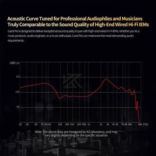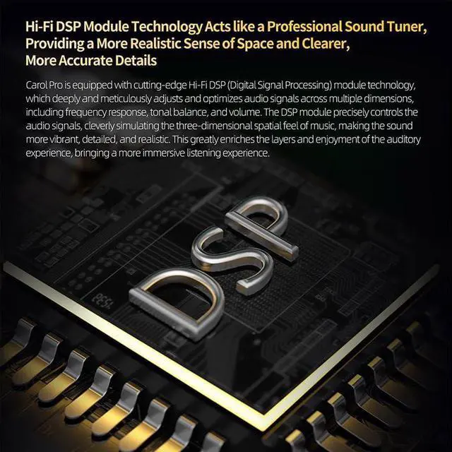HIFI DSP MODULE TECHNOLOGY The KZ Carol Pro wireless earbuds is equipped with HiFi DSP (Digital Signal Processing) technology. This technology can deeply and optimize audio signals, covering multiple dimensions such as frequency response, timbre charm, and sound balance. It provides more treble details. With its sophisticated algorithms, the DSP module can precisely control different frequency of the audio signal, ingeniously simulating the 3D spatial sense of music, making the music presentation more vivid, delicate,rich.