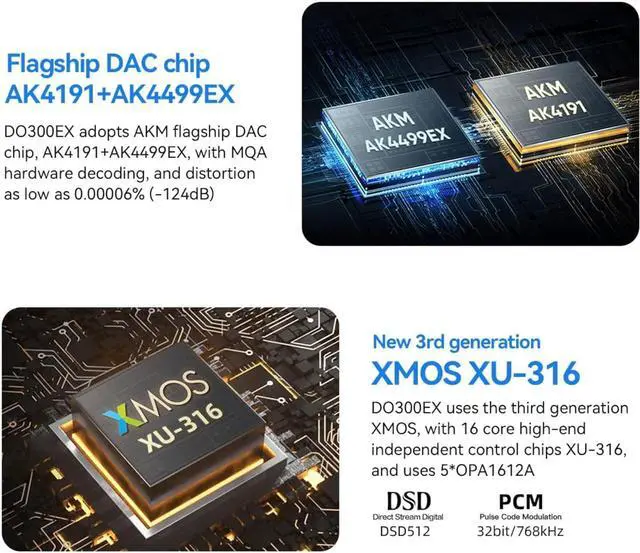AKM DAC Chip-Set : Benefit from XMOS XU-316 and 5*OPA1612A chips, DSD512, and 32bit/768kHz support, ensuring high-quality audio playback with low noise power supply