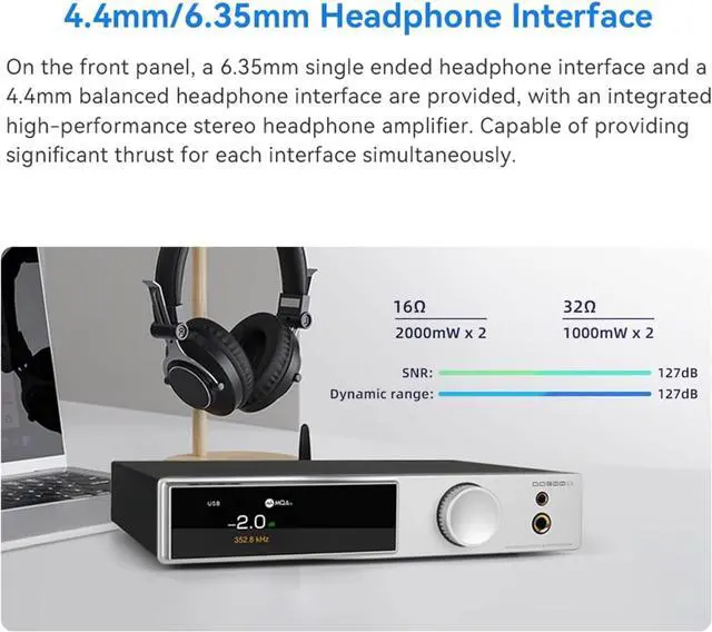 Versatile Headphone Amplification : Enjoy powerful audio with 2000mW(16)/1000mW(32) HPA output, 4.4mm/6.35mm headphone outputs, and 127dB SNR & dynamic range, catering to various headphone types