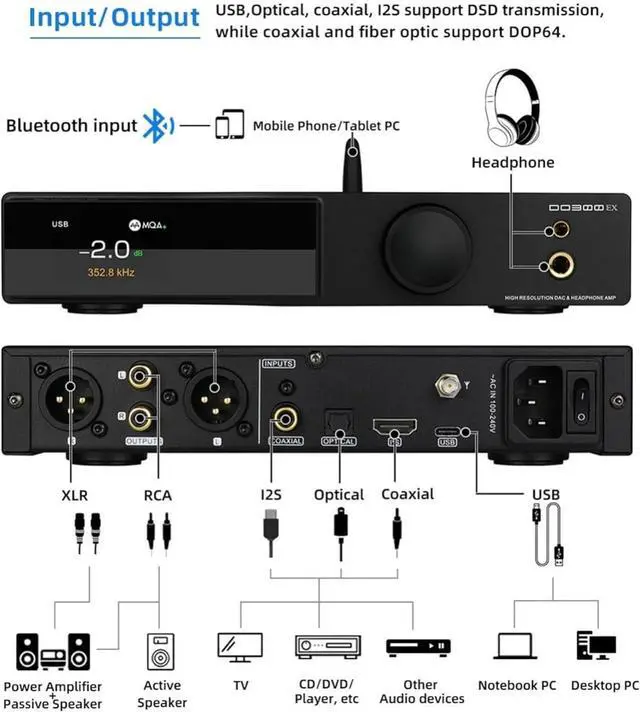 Rich Connectivity Options : Connect effortlessly with 5 input options(USB, Optical, Coaxial, IIS, Bluet...), 2 headphone outputs, XLR/RCA line outputs, and MQA-CD support, providing versatility for your audio setup