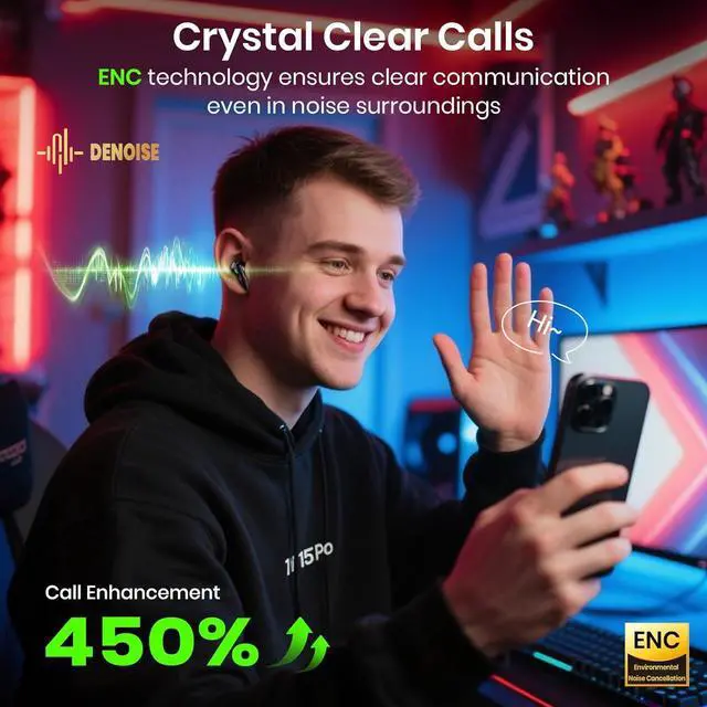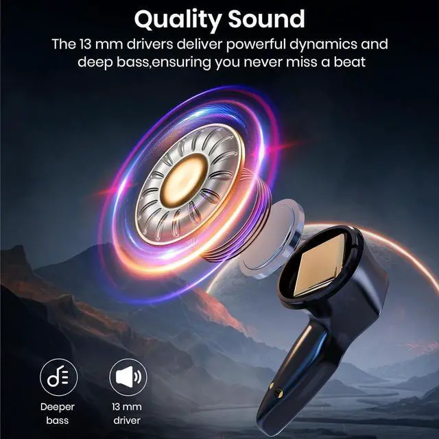 High-fidelity audio and ENC microphone: Wireless earbuds offer immersive sound through a 13mm composite diaphragm, reproducing bass and clear vocals. The Bluetooth headset is equipped with an ENC microphone, ensuring clear calls even in crowded environments.