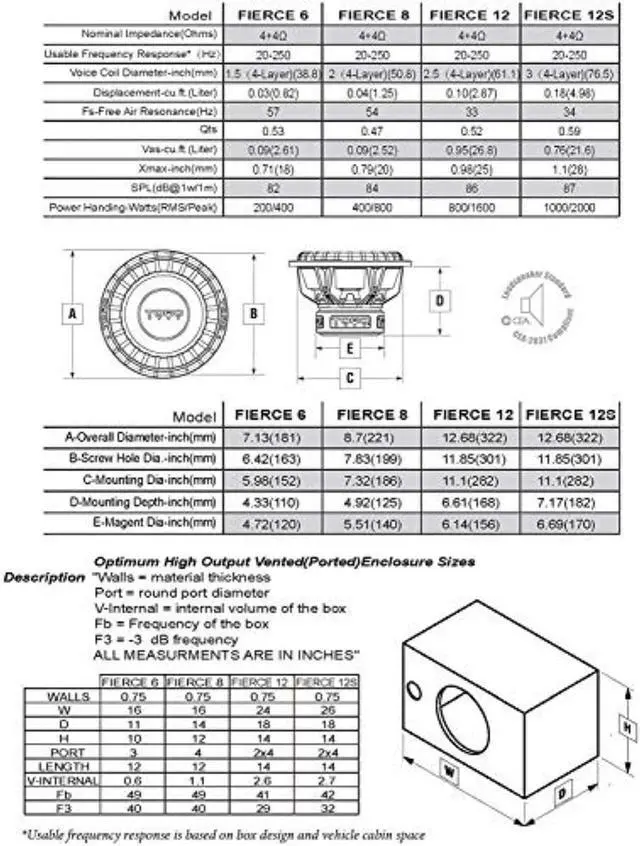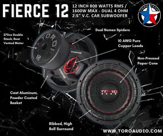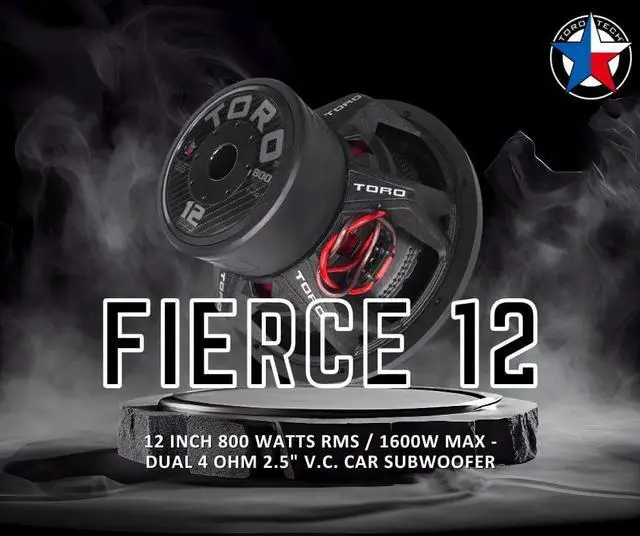 The TORO Fierce 12 is a 12 Inch Dual 4 Ohm Car Audio Subwoofer that is 800 Watts RMS / 1600 Watts MAX and is CTA Compliant to guarantee they handle rated power. 8 Gauge Oxygen Free, Silver Tinned, Pure Copper Wire, Heavy Duty Triple Tinsel Leads, Stitched Cone for an Extended Lifespan, Black Anodized One Piece Pole-Plate for Added Motor Force, Sold as each.