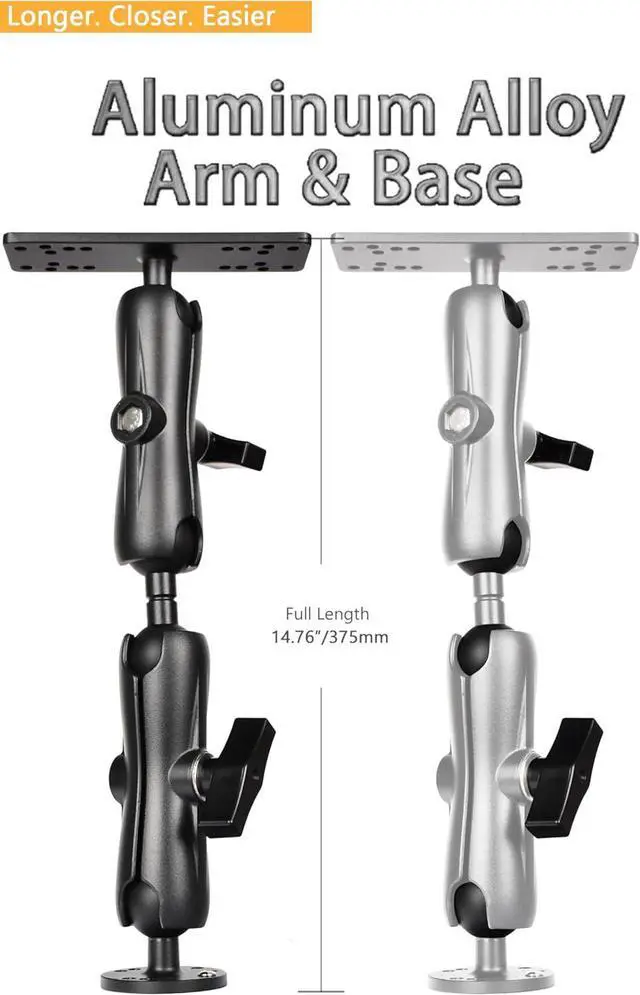 Extended Adjustable Arm 14.76" Total Length The 14.76-inch full-length mount provides a wide range of adjustments, allowing you to position your electronic device closer to your line of sight. This reduces the need to look down while operating, enhancing comfort and convenience. The flexible adjustability ensures an optimal viewing angle for clearer navigation and fish detection.