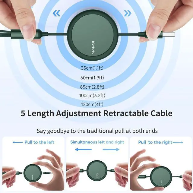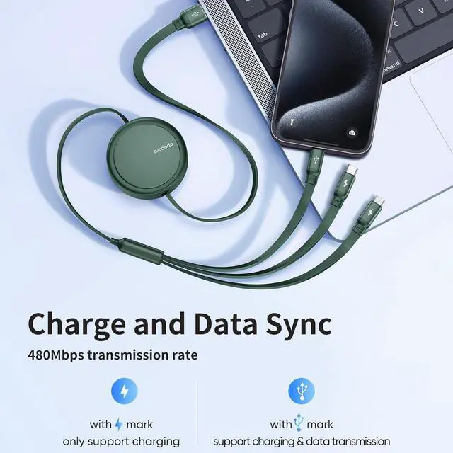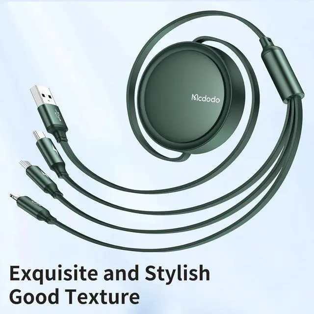 3 in 1 Multi Charging Cable: Mcdodo Beat Drum retractable Cable provides three different ports, USB C, Micro USB, an One cable can meet your diverse charging needs. You don\u2019t have to use multiple cables for multiple devices.it can charge three different devices at the same time, suitable for various mobile phones, tablets, laptops, power banks, small appliances, wall chargers and car chargers, charging faster than most 3-in-1 cables Faster.