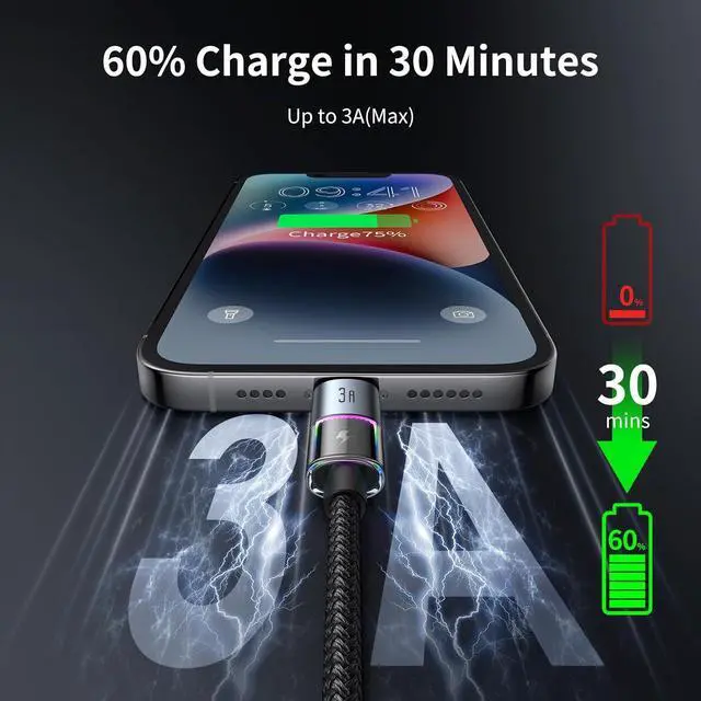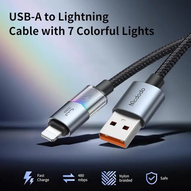 7 Colorful LightsThis lightning charging cable lights up with seven vibrant colors while charging, making the experience both fun and eye-cathcing. Especially during gaming, the dynamic colors create a powerful visual impact, elevating your overall gaming experience
