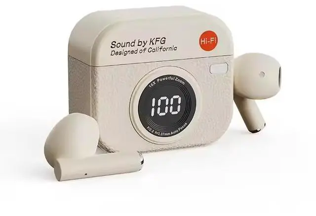 Unique Retro Camera Design: Stand out with a truly distinct look. The charging case and earbuds feature a classic camera-inspired leather grain texture and physical dial buttons for a premium, tactile feel.