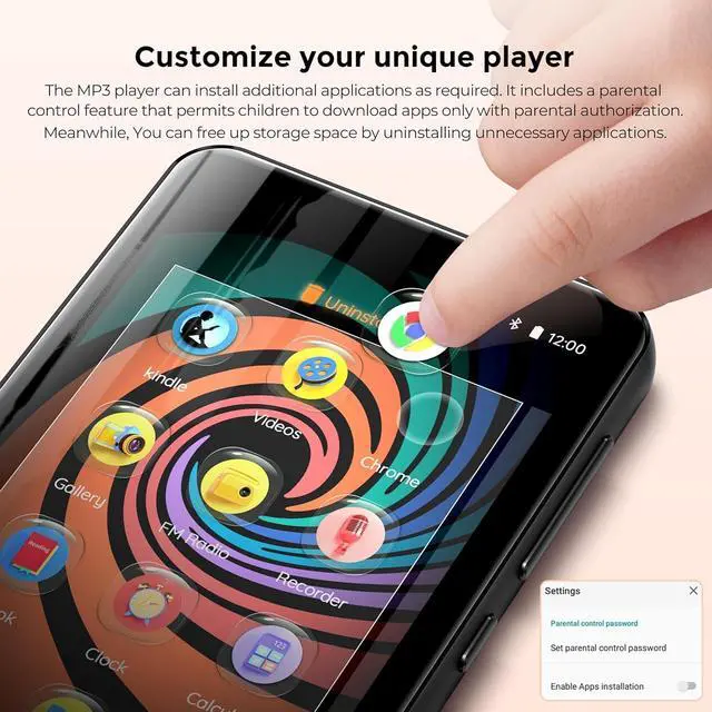 Customise Your MP3-The mp3 player with bluetooth can install additional apps and upgrade existing apps to the latest version. The music player includes a parental control feature that permits kids to download apps only with parental authorization. Meanwhile,You can easily delete the apps you don't need to save memory. Note: The mp3 player can not install apps that require support from Google player services,such as YouTube, YouTube music . (The mp3 does not include Google player)