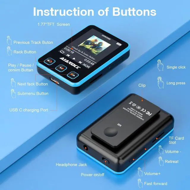MP3 Player with Sports Clip: Measuring 2.32 inches long, 1.56 inches wide, and 0.67 inches high, it weighs 31g and is compact and portable. It features a large 1.77-inch color screen for clear content display. The MP3 player has a built-in 32GB memory, which can store over 1,000 songs and accepts a TF card (Not included).