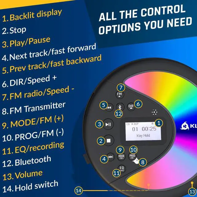 CD + BLUETOOTH + AUX + SD CARD READER + FM RADIO + FM TRANSMISSION + RECORDING + SPEED CONTROL + EQUALIZER + RECHARGEABLE BATTERY. At KLIM we took the discman from the 90s into the next century, and upgraded it with the necessary modern technology. The KLIM Discover is by far the most versatile portable cd player on the market. Whatever your needs are, we have you covered (also with a assurance).