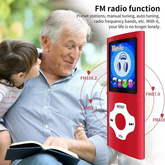 The old man listens to FM radio, for children learn language, listen to music or watch movies.