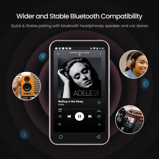• WiFi and Bluetooth Connection - Wifi mp3 player not only provides USB cables to upload music and videos, but also can share or transfer files via bluetooth and wifi. And it is also compatible with other versions of bluetooth devices, such as headphones, speakers, car stereos, and provides fast pairing and stable connections.