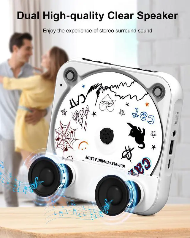Compact Bluetooth CD Player with HiFi Speakers TransmitterThis Portable CD player truly caters to all your listening needs. Whether you're using Bluetooth to wirelessly stream your favorite tracks to an external speaker, plugging in the included headphones for private listening, or utilizing the built-in HiFi speakers, the sound quality is clear and solid.