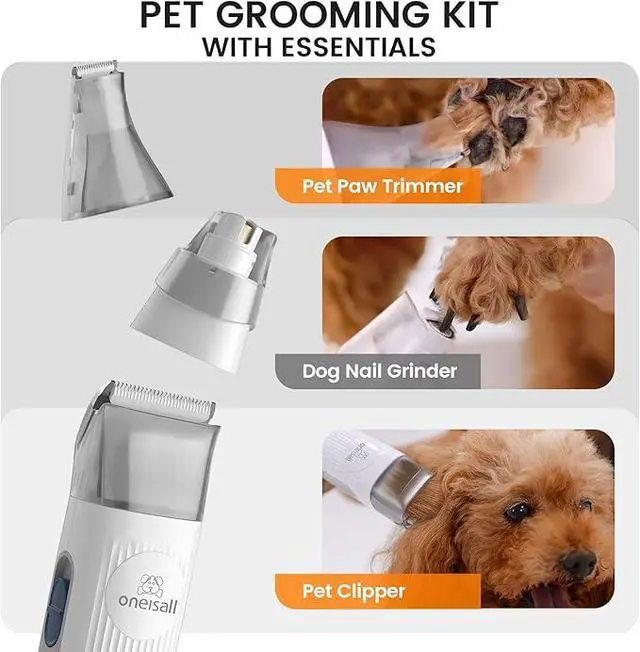 7 in 1 Pro Pet Grooming Kit,Keep the House Tidy: oneisall pet grooming kit with vacuum make home grooming easy.The grooming brush and the deshedding tool gently remove loose hair and making pet hair shiny and smooth while eliminating tangles. Electric clipper, dog paw trimmer and dog nail grinder provides excellent cutting. Give your pet a best grooming experience. Nozzle head and Cleaning brush can be used for collecting pet hair falling on the carpet, sofa and floor