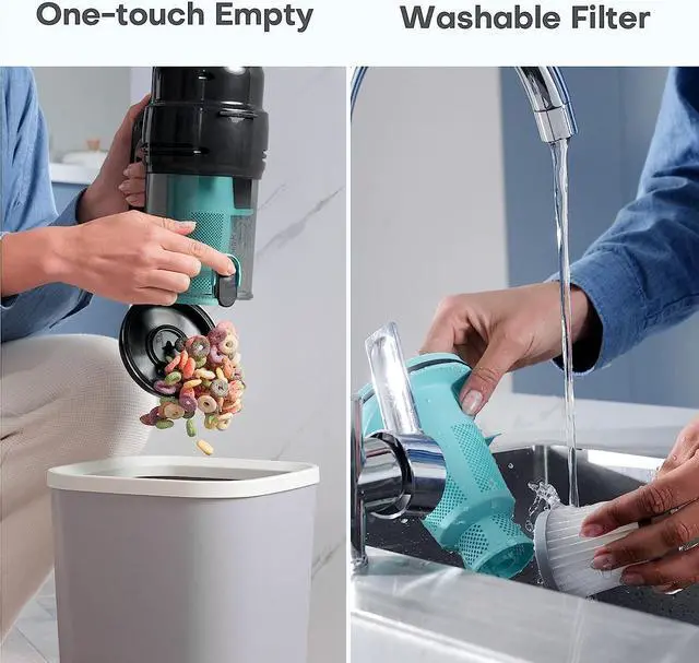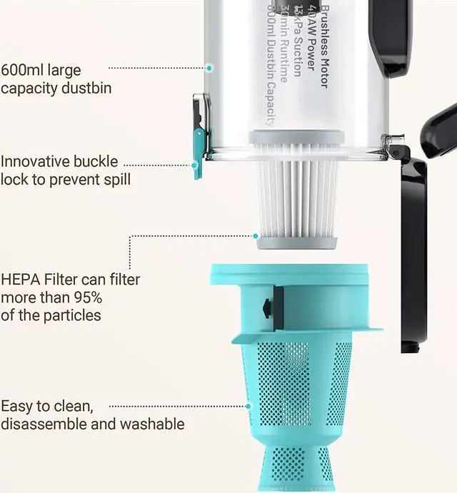 Easy to Clean - Empty debris with one click without staining your hands, and innovative buckle lock prevent spills. Filters are washable and recyclable. The large 600ml dustbin reduces the need for empty dust frequently, so you won' t have to stop cleaning midway