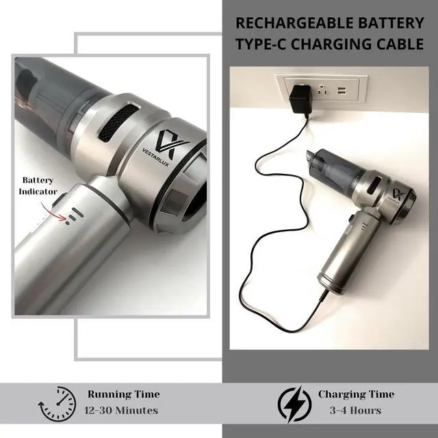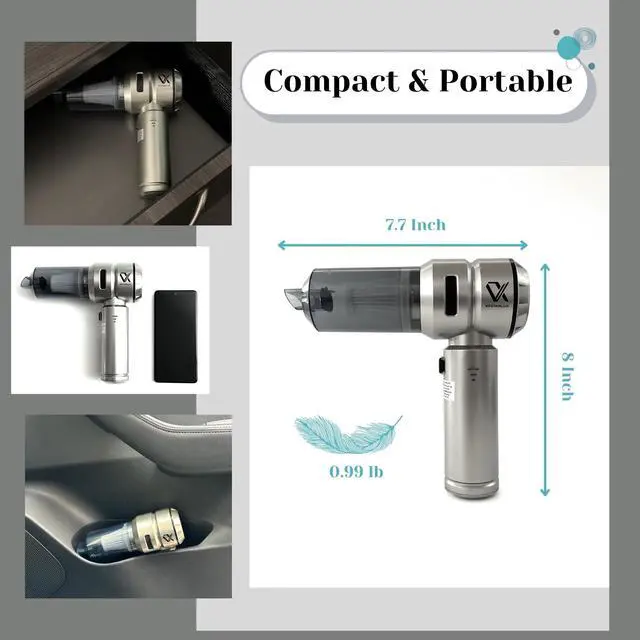 25000PA Powerful Suction: Features upgraded brushless motor technology with up to 25000PA suction power. Three adjustable suction and blowing modes tackle car dust, pet hair, food crumbs, and more with ease. Long press for 3 seconds to start, and short press to switch modes, allowing customized cleaning power. 4-IN-1 Multi-functional Design: Offers four functions: suction, blowing, inflation, and vacuum compression. Perfect for thorough cleaning, dust removal, bag compression, and inflating items like swimming rings and balloons, ideal for home or outdoor use. Long-lasting Battery Life: Built-in 6000mAh high-capacity battery supports 1230 minutes of runtime after a full charge. Charges in 34 hours with Type-C fast charging. Includes a USB-C cable for charging via computers, power banks, car chargers, or adapters. Battery indicator (red for charging, green when fully charged) ensures timely charging. Note: Fully charge before first use. Compact & Portable: Weighing only 0.99lb, its lightweight and easy to store in cars or at home. The cordless design ensures flexibility, while the ergonomic handle offers comfort for one-handed use. Effortless Maintenance: The detachable design makes garbage disposal and cleaning simple. The washable and reusable HEPA filter ensures optimal suction while protecting the motor from dust. Tip: Dry the filter completely before reassembly.