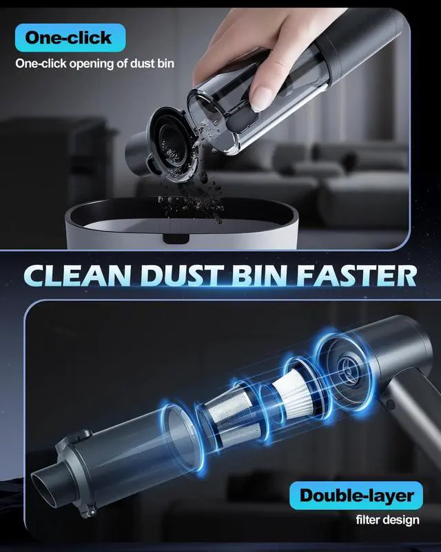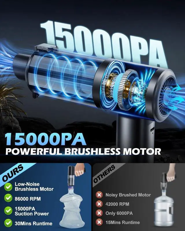 | Special Feature | 15000PA Strong Suction, Cordless, Dual Filtration System, LED Light, Portable |