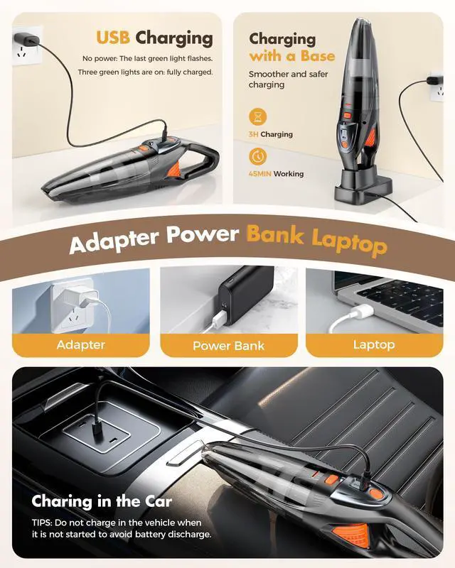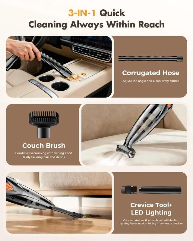 Experience powerful cleaning convenience with this compact handheld vacuum featuring an impressive 25000PA suction capacity. This cordless vacuum weighs just 1.37 pounds and measures 5.7 x 3.9 x 12.4 inches, making it perfect for quick cleanups around your home. Equipped with a HEPA filter and 600ml collection capacity, it effectively tackles dust and debris on all floor types. The battery-powered design offers complete freedom of movement without the hassle of cords. The package includes a comprehensive accessory kit to handle various cleaning tasks. With its sleek deep orange and black design, this vacuum combines style with functionality. The 11.1V power system delivers reliable performance for your everyday cleaning needs. Its lightweight construction and ergonomic design make it ideal for cleaning stairs, furniture, car interiors, and hard-to-reach spaces. The versatile attachments allow you to tackle different surfaces and corners with ease, while the cordless operation ensures maximum maneuverability throughout your cleaning tasks.
