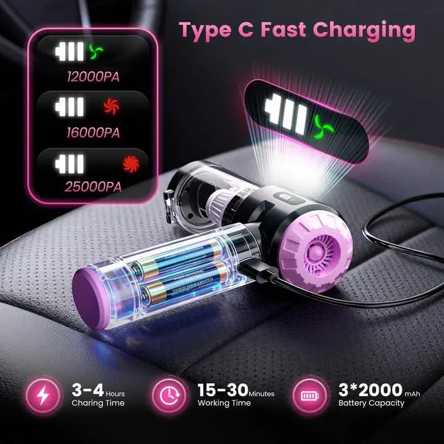 Engineered with a practical folding design, this vacuum fits neatly into your bag or glove compartment. Combined with its cordless freedom and Type-C fast charging (full charge in 3 hours), it’s always ready to grab and go – perfect for quick cleanups anywhere, anytime.