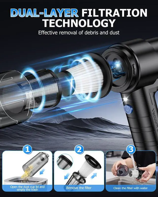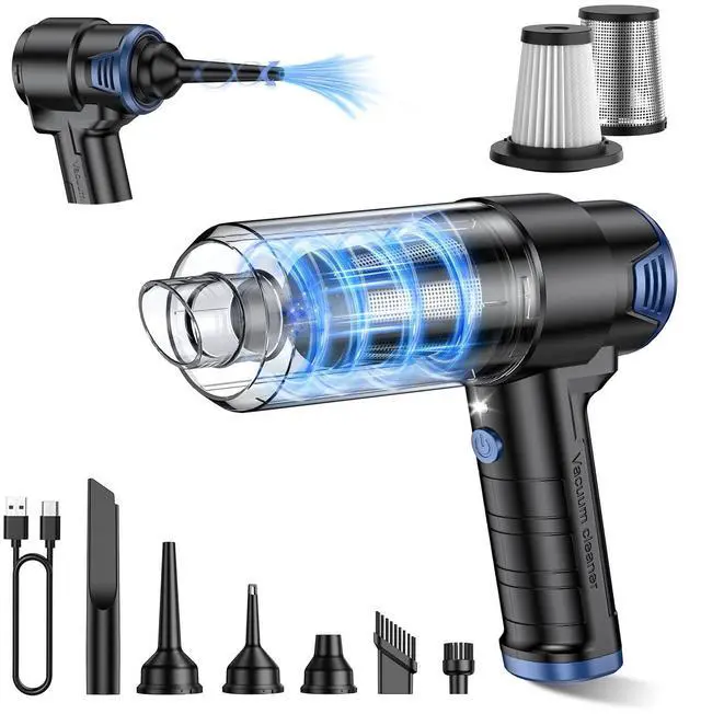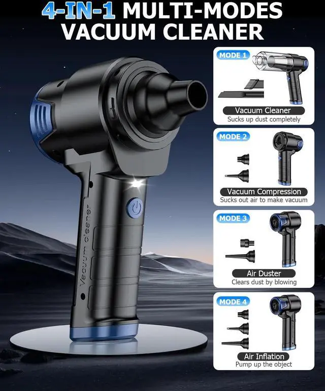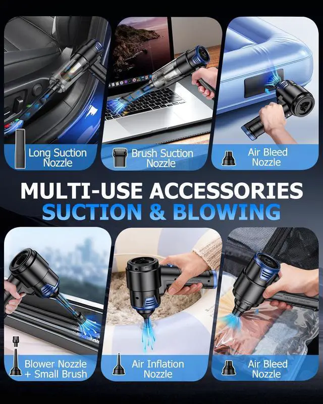 4-In-1 Multifunctional VacuumThis handheld vacuum cordless comes with 6 accessories, enabling 4 key functionsvacuuming, blowing, inflating, and vacuum compressionto meet cleaning needs. The brush nozzle can easily clean pet hair and all kinds of debris; The suction nozzle and blowing nozzle can blow away surface debris but also clean dust in gaps. Additionally, Inflatable mouth and pumping nozzle can inflate or deflate items like swimming rings, making it practical